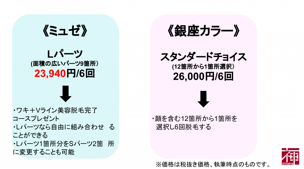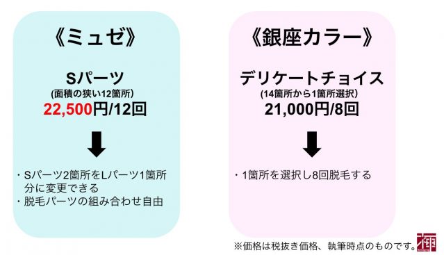 ミュゼといえば、ワキやVラインといったパーツ脱毛が有名です。そこで、同じくパーツ脱毛で知名度の高い銀座カラーと料金等の比較をしました。