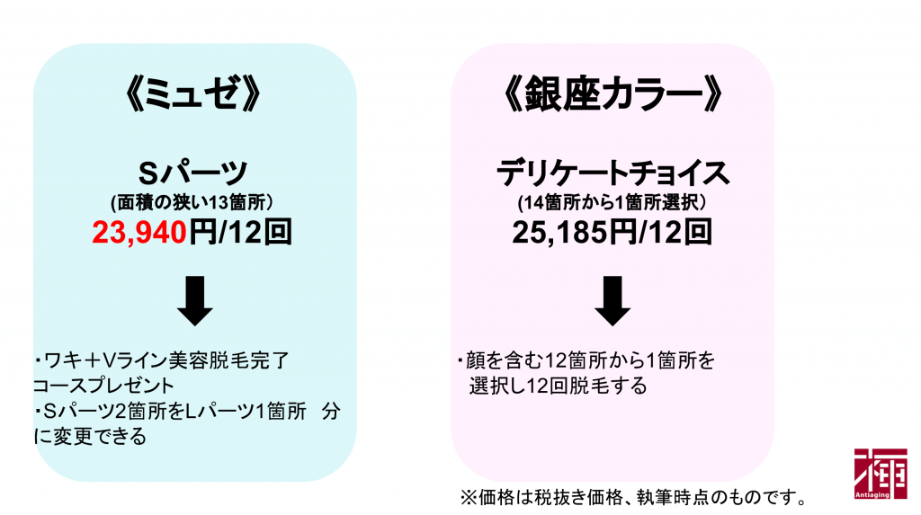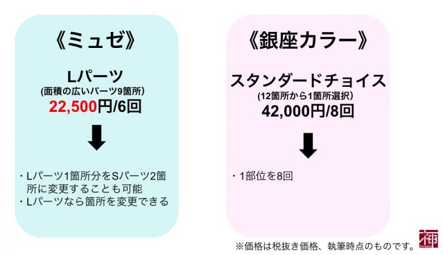 ミュゼと銀座カラーではパーツの分け方に多少違いがありますが、基本的には大した差はありません。料金の違いで見ると、ミュゼの方がコストメリットがあります。