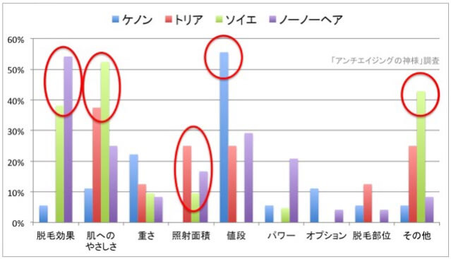脱毛器自体の満足感が高かった、ケノン・トリアは脱毛効果に対する満足度が突出して高いのが分かります。