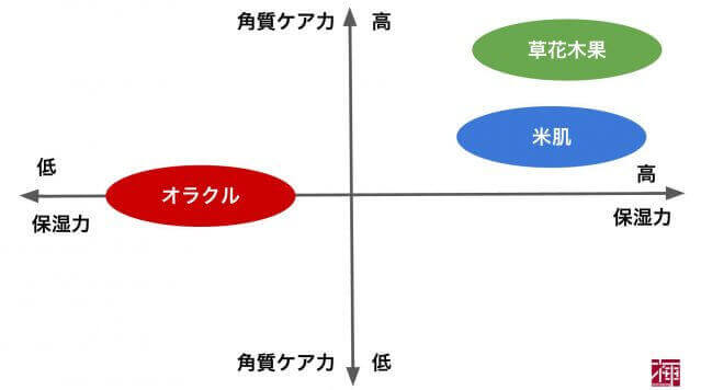 草花木果と米肌は保湿力が高いですね。2時間後の水分減少率も少なく、保湿力に優れていることがわかります。一方オラクルはあまりうるおい力のない結果です。