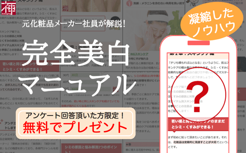 プロが考える美白対策とは、どのようなものなのか。スキンケアから、食事、コスメ・基礎化粧品選びまで「美白完全マニュアル」として1ページにまとめています。こちらを感謝の気持ちを込めて、アンケートに答えて頂いた方全員にプレゼントしたいと思います。アンケートは以下の簡単な質問にお答え頂くだけです。